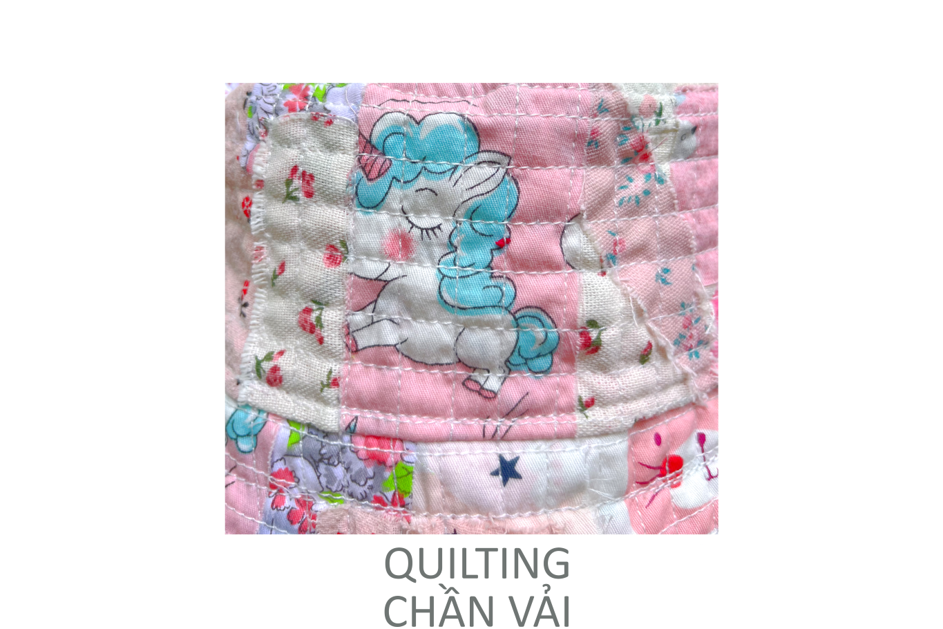 • Made from scrap fabric that is quilted using a sewing machine.